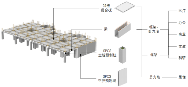 本項(xiàng)目采用SPCS結(jié)構(gòu)體系的多種新技術(shù),其中包括疊合柱一次成型技術(shù)、空腔柱“四角金砼+四邊天鐵”組合連接技術(shù)、不出筋桁架疊合板技術(shù)。